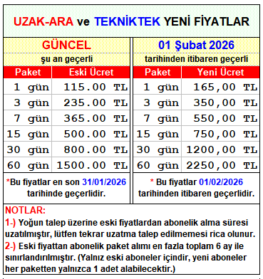 Eski fiyatlar 01 Şubat 2026 tarihine kadar geçerlidir.